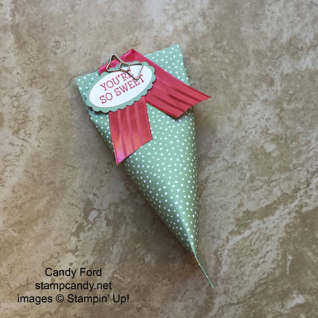 These sour cream containers are adorable, and they’re super quick and easy to make. We started with a 6″ x 6″ piece of Birthday Bouquet Designer Series Paper. We put adhesive along the top and bottom edges and along one side edge, then rolled it to make a tube, adhering the sides – I prefer Fast Fuse for this because it’s very strong. We pinched the bottom closed so it was flat.