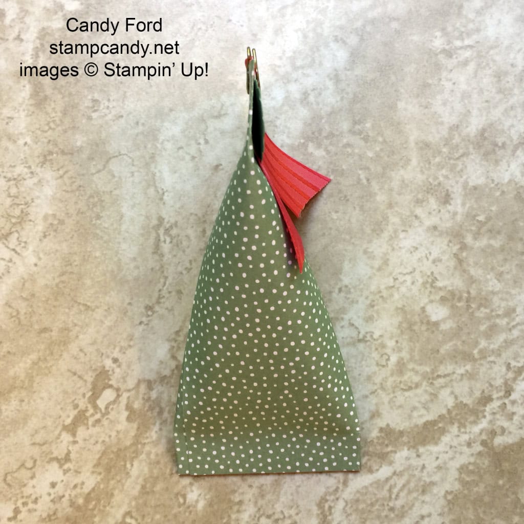 At this point we put our goodies inside the container, careful not to get them stuck on the adhesive around the inside top edge. Then we pinched the top closed so it was flat and perpendicular to the bottom.