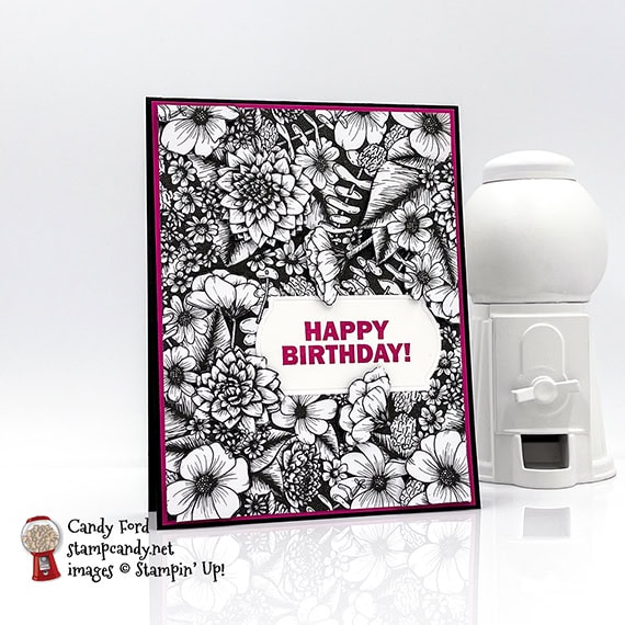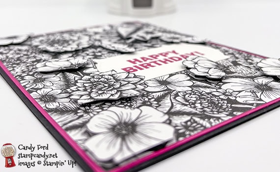 - fussy cut flowers adhered onto the DSP layer using Black Stampin’ Dimensionals