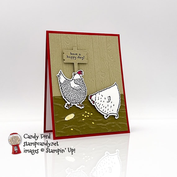 I used the Hey, Chick bundle (Hey, Chick stamp set and Chick Dies) along with the Pinewood Planks and Old World Paper 3D Embossing Folders to create this barnyard scene. The sentiment can be used for a birthday or any other time you want to with someone a happy day.