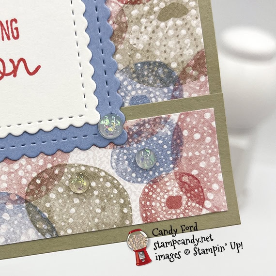 - Basic White CS with balloon glued onto the DSP layer on the inside of the card, with the scallops lined up so that it’s hidden by the Seaside Spray CS when the card is closed