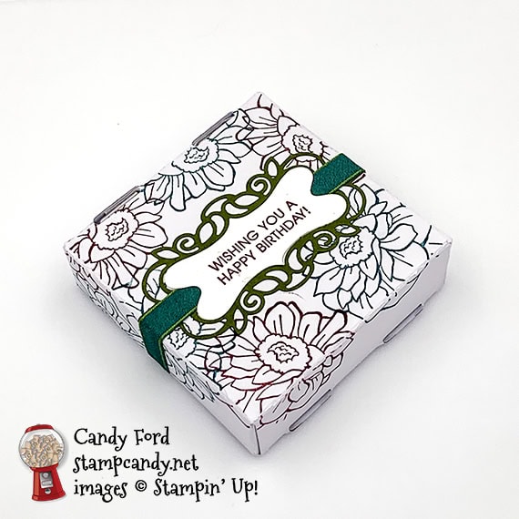 - Mossy Meadow die cut piece glued onto the top of the box, with the side pieces folded down onto the sides of the box