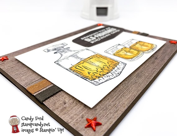 Welcome to the August 2020 Candy Hearts Blog Hop! This month’s theme is Birthday. I used the Whiskey Business stamp set, the Tasteful Labels Dies, and In Good Taste Designer Series paper to create my card. The main colors are browns, yellows, and white. I added a few Real Red touches because the person I made this card for really likes red. If you don’t want the red, you can leave the Star Designer Elements copper, and use Early Espresso ink on the inside of the card.