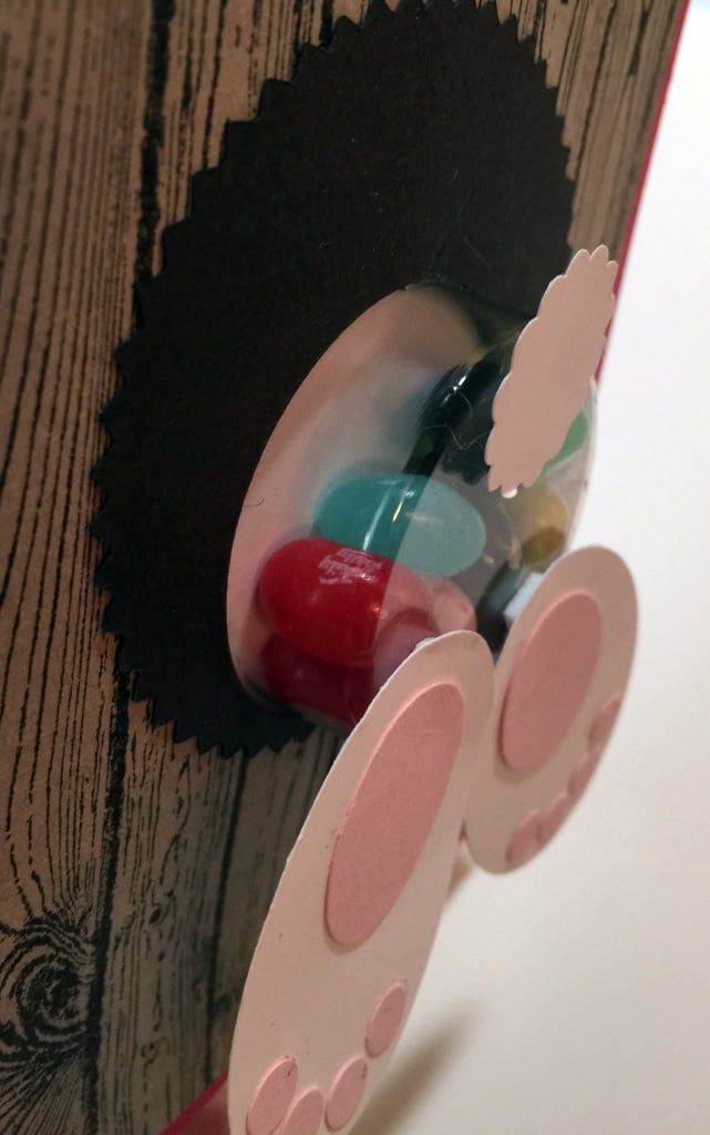 Here’s one I did with the white backing. It accidentally got stepped on, plus I didn’t ink the edges of all the punched pieces, so I didn’t use it for the main photo above, but you can see the difference in the color behind the jelly beans.
