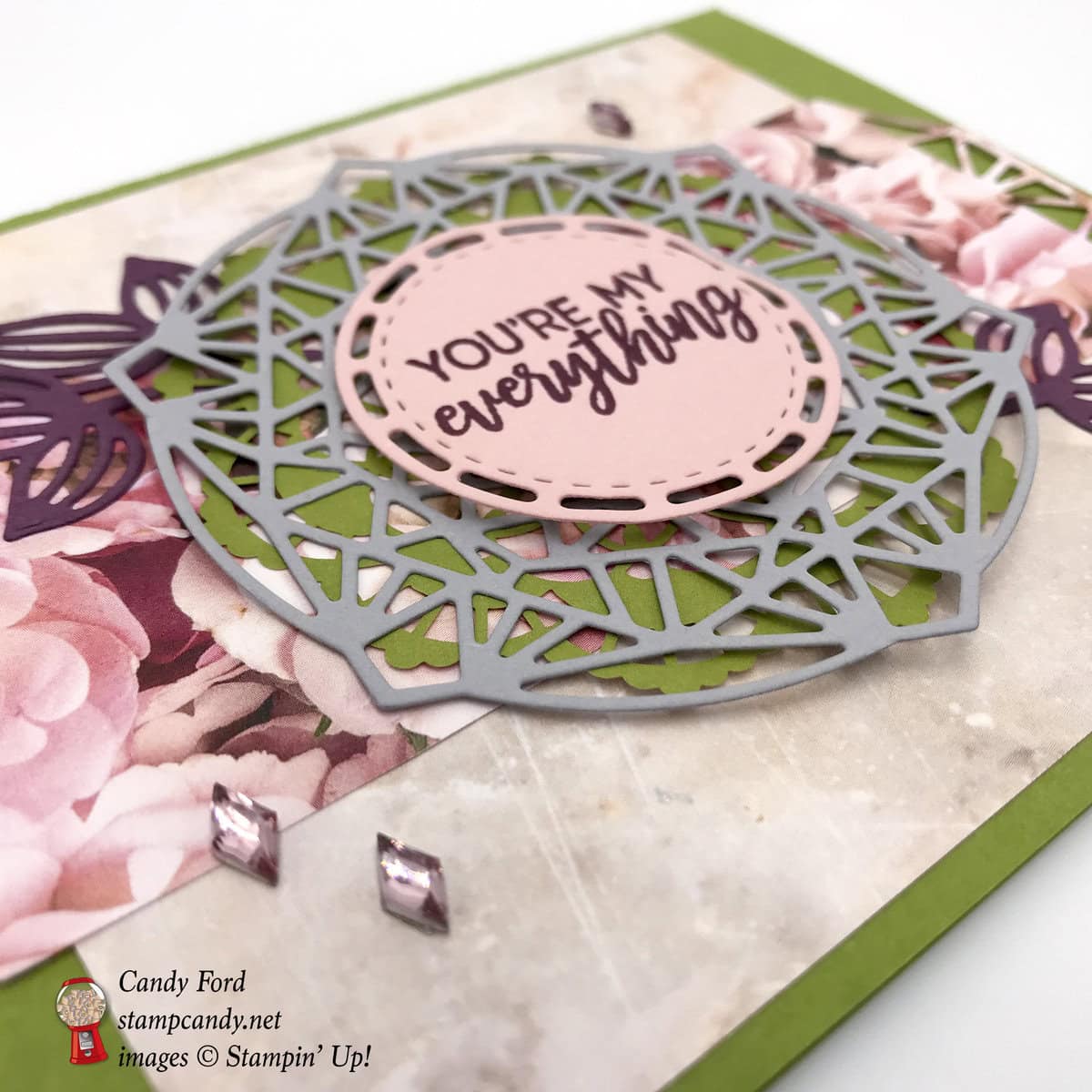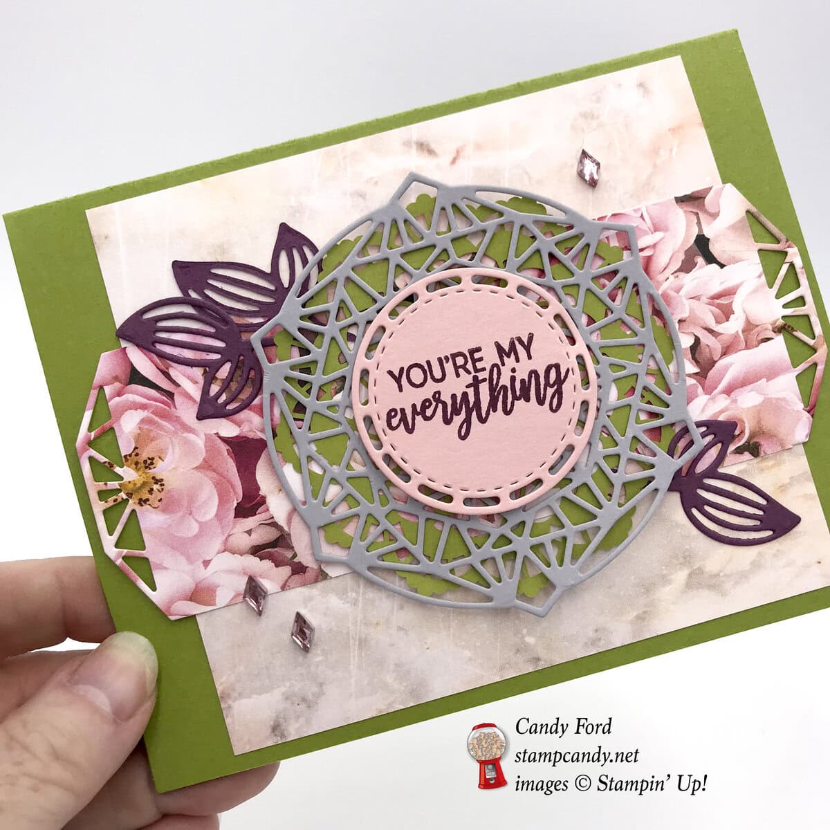 It’s Paper Palooza on the ICS Blog Hop today! July’s theme is Designer Series Paper (DSP) which is perfect since Stampin’ Up! is having a DSP sale in July. You can see more details on the sale near the bottom of this post. For my card today I used the Petal Promenade DSP, a beautiful floral set with lots of pinks. I also used the Beautiful Promenade bundle and Petal Pink Rhinestone Gems. They’re all part of the gorgeous Petal Promenade Suite.
