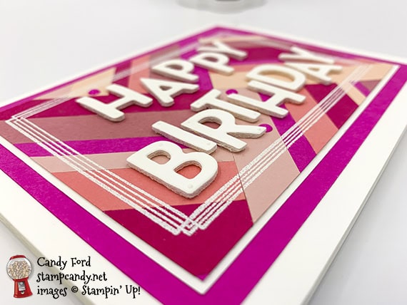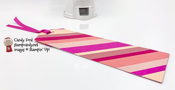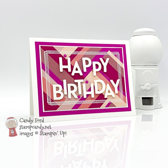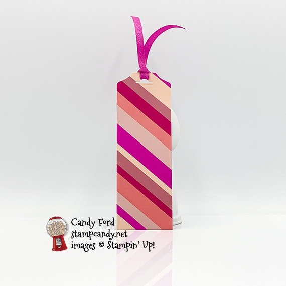 Welcome to the July 2020 OSAT Blog Hop! This month’s theme is Pretty in Pink, so we’re featuring the amazing pinks in the Stampin’ Up! color line up. As usual, I couldn’t choose just one, so I used them all: Petal Pink, Blushing Bride, Flirty Flamingo, Rococo Rose, Melon Mambo, and Magenta Madness. I cut strips of card stock in all the colors and arranged them in a sort of pinwheel design for the front of the card. The sentiment I cut using the Playful Alphabet Dies, Whisper White Card stock, and the new Foam Adhesive Sheets. I stamped the frame from the Swirly Frames stamp set and heat embossed it in white. For the tag, I covered one side in the same strips, and cut the top with the Fancy Tag Topper Punch.