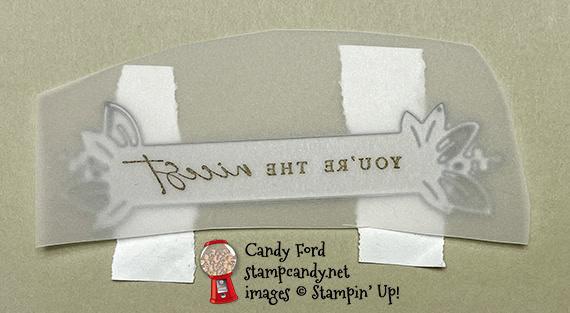 - Since the die is solid, I lined up the sentiment on the back (easy to do with the Vellum) and held it in place with Post-It tape.