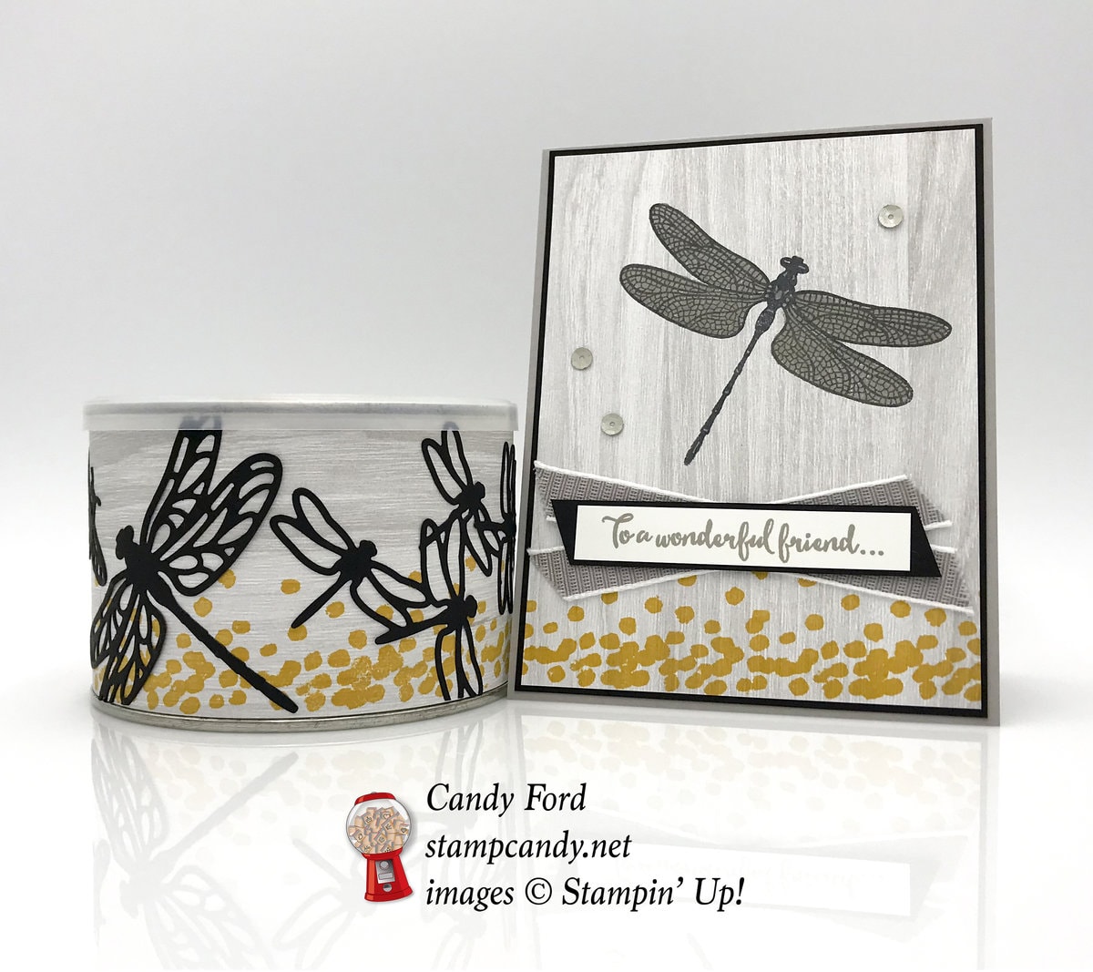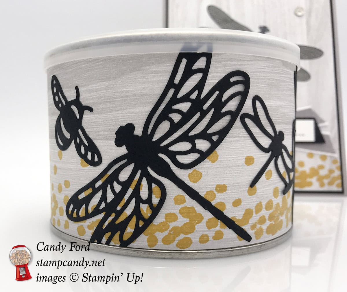 It’s time for the OSAT Blog Hop for August! This month we’re doing a Tic Tac Toe challenge. We must choose three items in a row (horizontally, vertically, or diagonally) and include all three on our projects. I used the Dragonfly Dreams stamp set and Detailed Dragonfly Thinlits Dies to create this card and gift container. The container came with cashews in it. Cashews would make a nice little gift, but since I ate the cashews already (they were honey roasted – how could I not?) I washed out the container and now it’s ready for candies or a small gift.