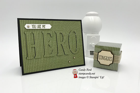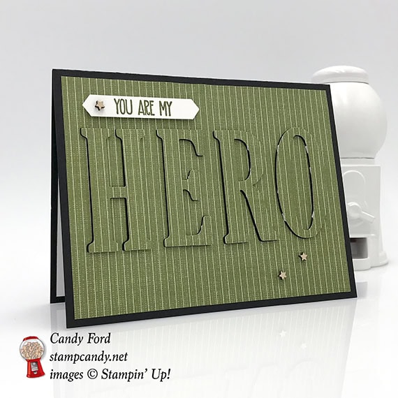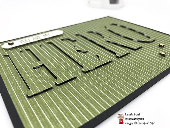 - die cut letters HERO adhered over the cut out spaces in the DSP layer using Mini Stampin’ Dimensionals