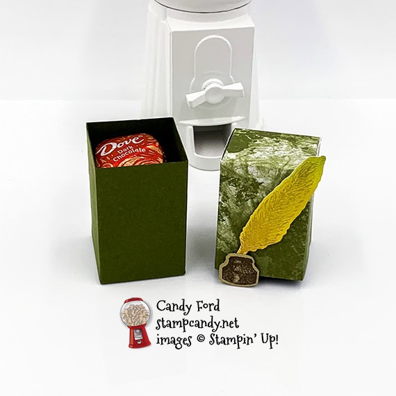 - tip of second feather glued onto the back of the inkwell, then both adhered onto the front of the box lid using Black Stampin’ Dimensionals