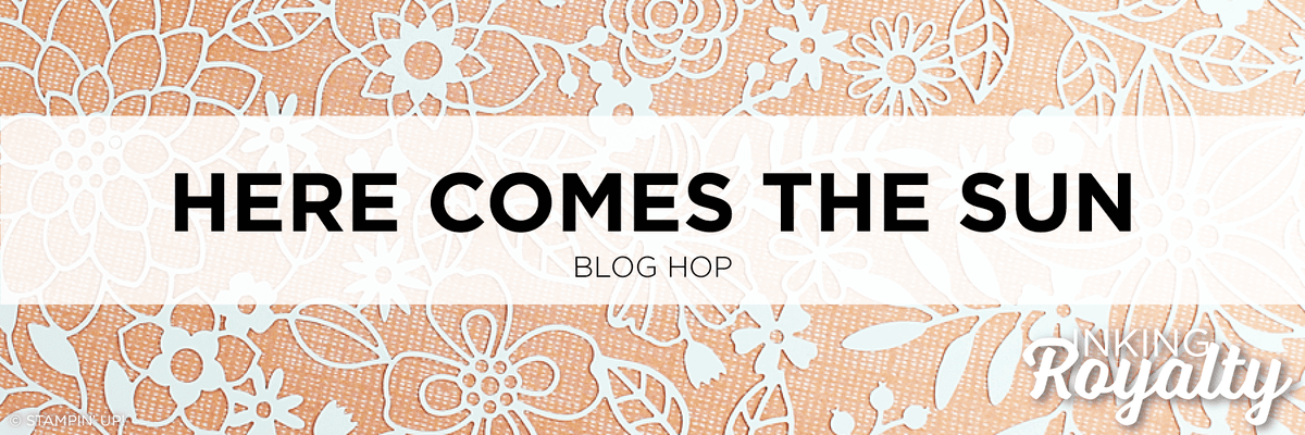 It’s time for the InKing Royalty Blog Hop for June! This year’s Blog Hop themes are inspired by popular songs, and this month’s theme song is “Here Comes the Sun.”As you can guess, our Blog Hop today is filled with projects that are inspired by the joy of the summer sun. We are excited to share our creations with you today! After you read my post, I hope you’ll hop over to the next person on the list at the base of this post. I chose the new stamp set aptly named Sunny Days for my card. The new In Color called Pineapple Punch the perfect color for sunshine. It’s so very bright and cheerful, you can’t help but smile. And Balmy Blue makes a sweet soft sky.