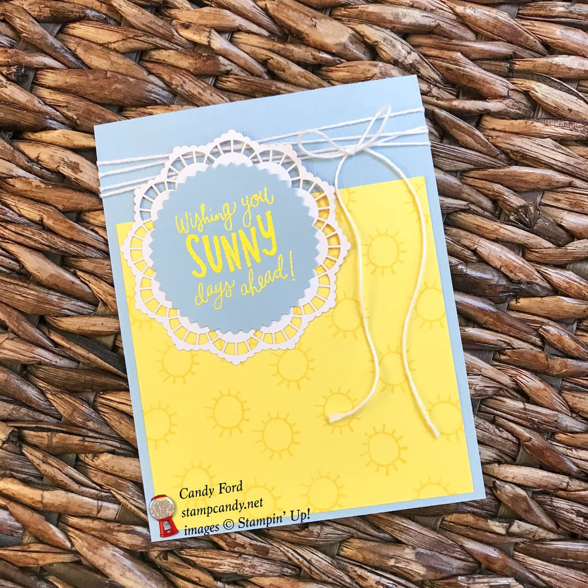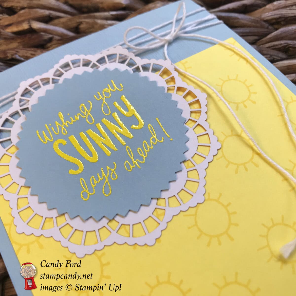 - sentiment and doily glued onto the card front, over the twine