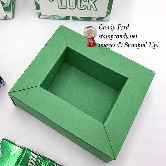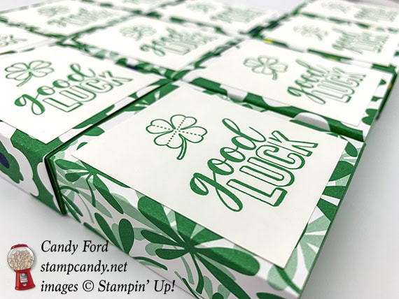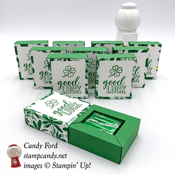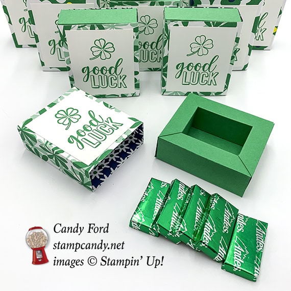 Today is the March Candy Hearts Team Meeting, and I’m sharing with you some little treat boxes I made for the Hearts. Each sliding box holds 5 Andes Mints… because they’re green… for St. Patrick’s Day. I used the Amazing Life stamp set (which contains a clover image,) Call Me Clover (of course) card stock and ink, and Happiness Blooms Designer Series Paper. I used two different patterns of the Designer Series Paper that have a lot of Call Me Clover in them.