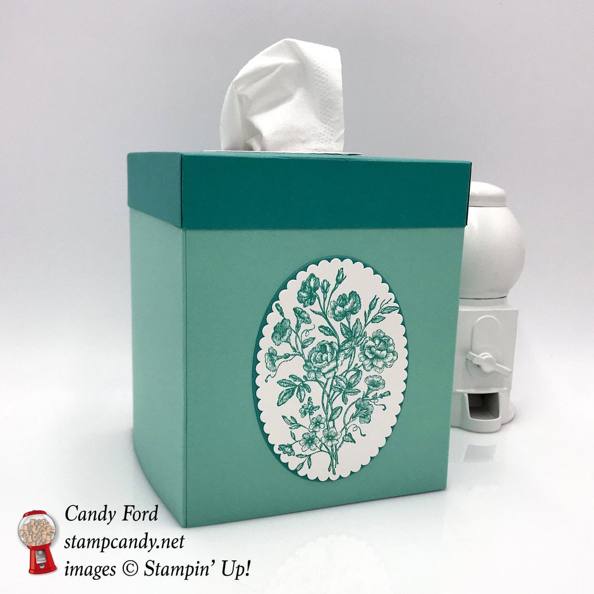 I can’t seem to get enough of the Very Vintage host stamp set. Especially the large floral image I’ve used today…..and the last few days. At least today’s project is a little different in that it isn’t even a card. It’s a tissue box cover. I like to make at least one whenever a new catalog comes out.
