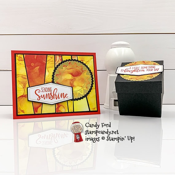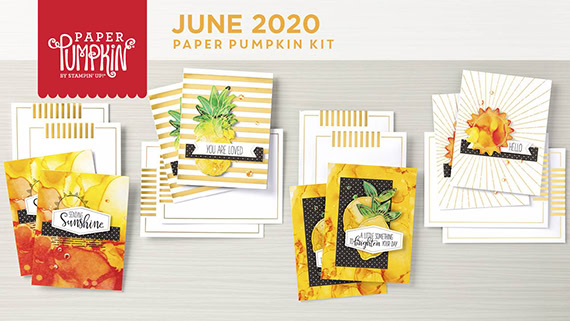It’s time for the 06-2020 APPT Blog Hop! This month’s kit is called Box of Sunshine, and it’s all about sending some sunshine to those who need it. Even the box is yellow, and there’s a label in the kit that covers the Paper Pumpkin logo, so you can mail some sunshiney goodies in it. For my alternate projects today, I used the kit to make a Scrappy Strip card and a treat box.