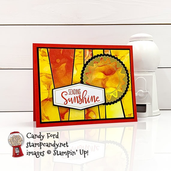 - a sun die cut adhered onto a gold foil scalloped circle using Stampin’ Seal
