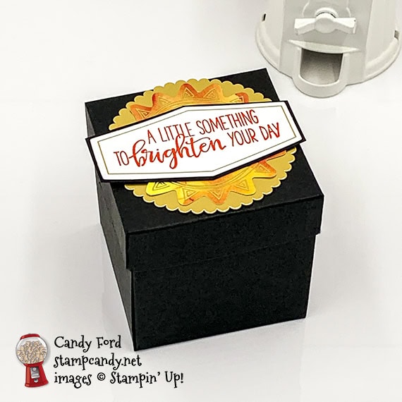 - gold foil scalloped circle adhered onto the Basic Black lid using Stampin’ Seal