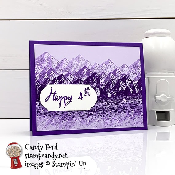 I started to make a more traditionally hued card, I really did, but I just couldn’t find my mojo. I started looking through my stamp sets for inspiration and realized I was humming “America the Beautiful.” Just when I got to the line “purple mountain majesties” my eyes fell upon the Mountain Air stamp set. Light bulb! So I used the Mountain Air stamp set to create a scene of purple mountains, along with a purple lake and a purple sky. I imagined one of those sunsets with vibrant purple at the bottom (you know the ones I’m talking about, right?) that casts its purple glow on everything for a brief moment.