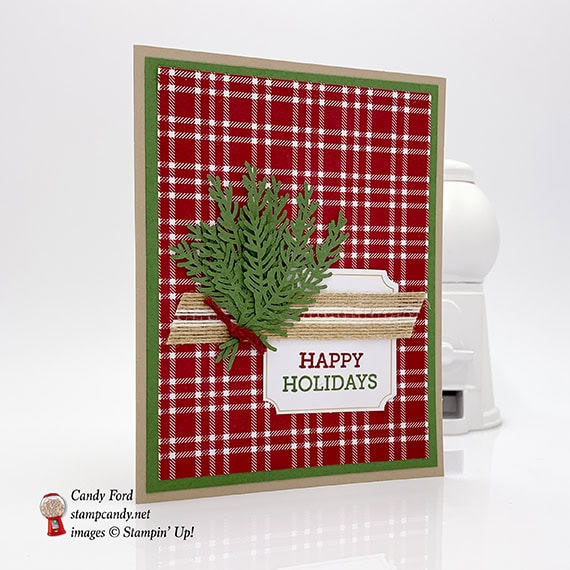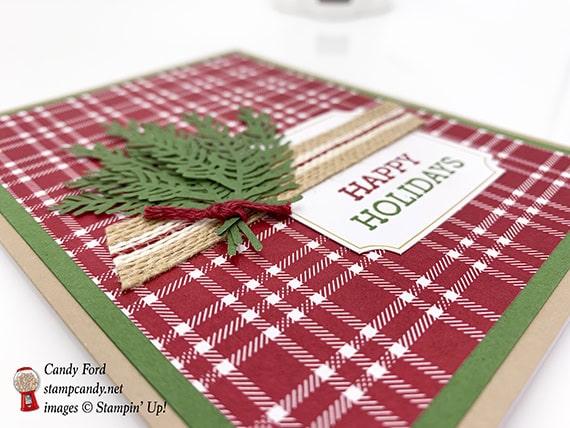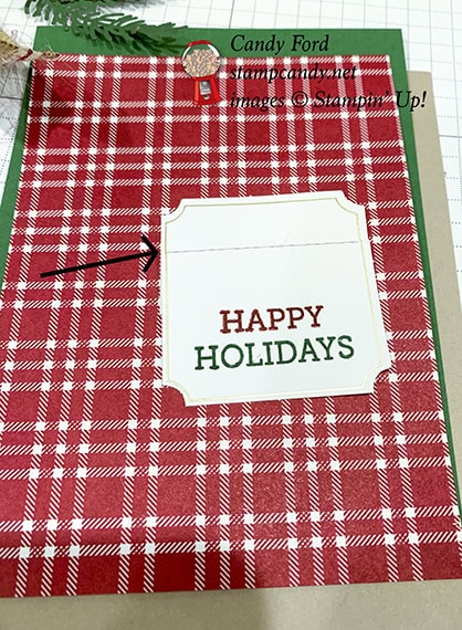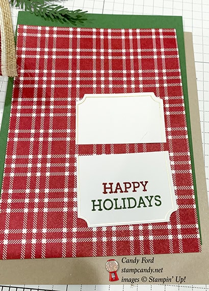 - the stamped half of the die cut label layered over the other half, to shorten it, and glued onto the plaid layer