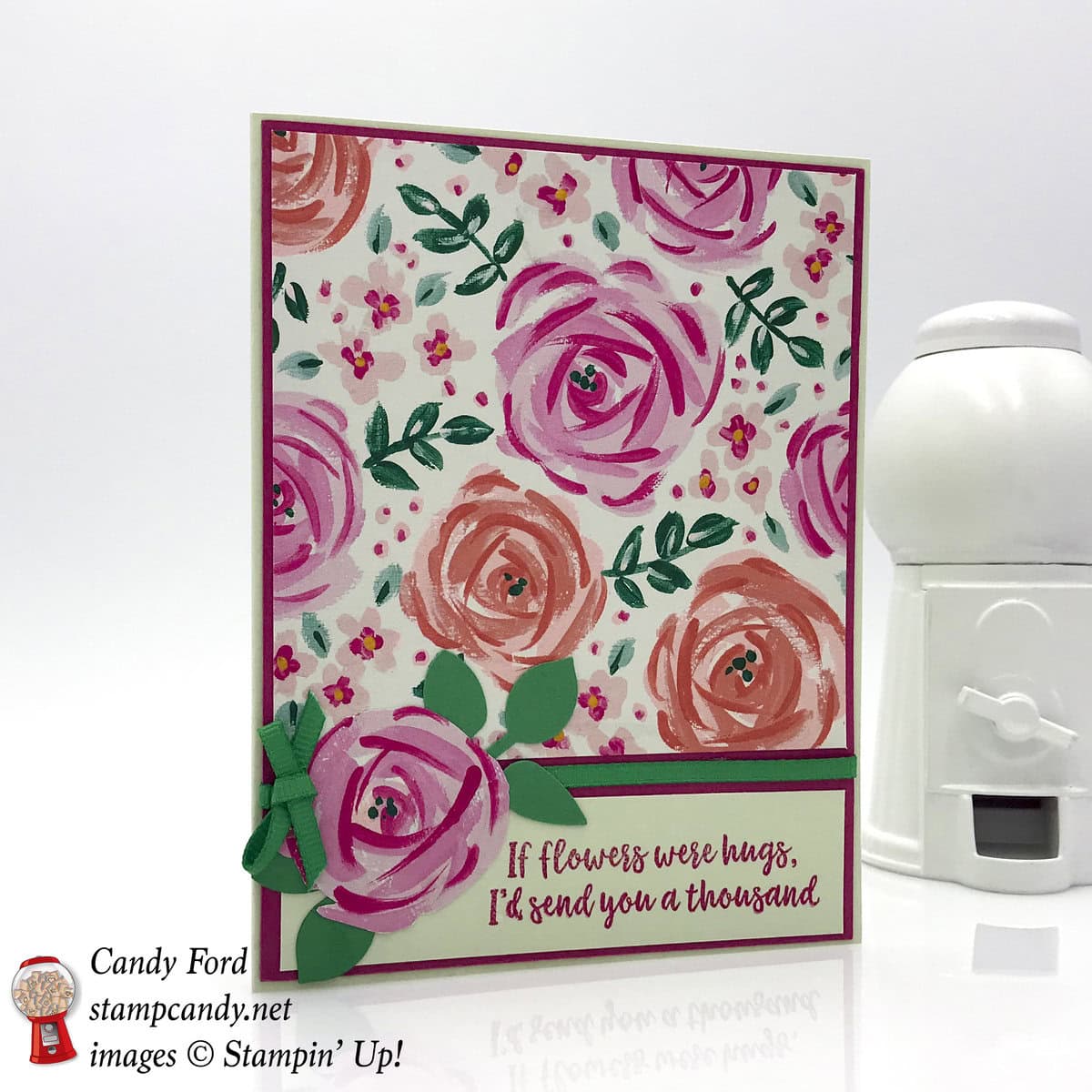Today’s card is a very pretty floral one for sending hugs to someone you care about. The Abstract Impressions stamp set and the Garden Impressions Designer Series Paper are perfect together. The Leaf Punch and Call Me Clover 1/8″ Grosgrain Ribbon add the perfect little touches. I’d love to hear what you think! Please comment below.