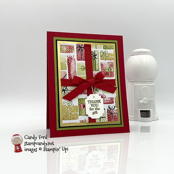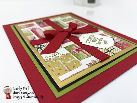 For today’s project I used the A Big Thank You stamp set along with the Ornate Frames Dies and Most Wonderful Time Specialty Designer Series Paper to create a Christmas thank you card. I crossed the ribbon and added a bow and tag so it looks like a gift.