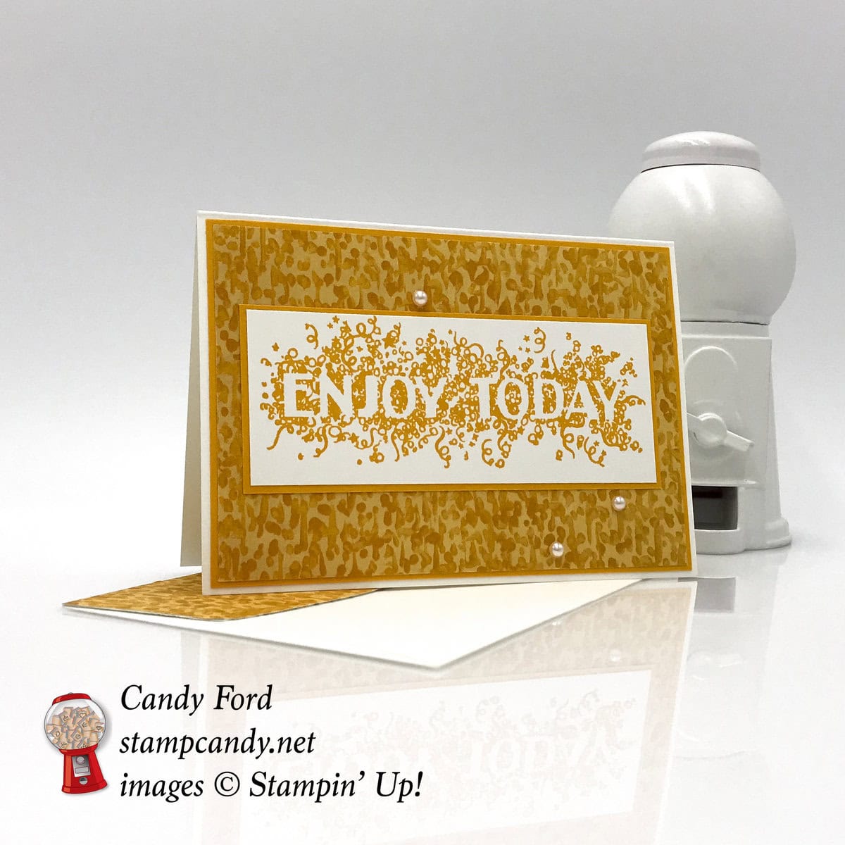 Notice the similarity between today’s card and yesterday’s card? The Designer Series Paper (DSP) in the background is the same pattern, but different colors. Another thing they have in common is their simplicity of design. The DSP does most of the talking. Today I’ve paired the new Big Wishes stamp set with Garden Impressions DSP and a new color, Mango Melody. Using the premade Note Cards & Envelopes makes card making especially quick and easy. What do you think?