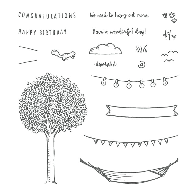 The In the Trees stamp set is has a lovely tree and lots of things to build scenes with. There are several things to hang between two of the trees, but how do you get the spacing just right? Enter the Stamparatus. This set was made to use with this amazing new tool – not that you have to us it, but it sure makes things a lot easier. See, the Stamparatus has hinges, and the plates (there are 2 reversible ones) come out and can be moved down one hinge space at a time. So with this stamp set, you stamp the tree, then step down 3 hinges and stamp again. Now the hammock, lights, etc. fit perfectly between the trees!