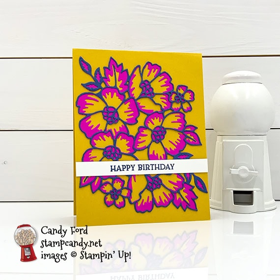 I used the amazing new Blossoms in Bloom Bundle (Blossoms in Bloom stamp set & Many Layered Blossoms Dies) to create today’s project. The two largest dies layer to create a stunning cluster of flowers. I used three of the new In Colors (Bumblebee, Magenta Madness, and Misty Moonlight) to create this Happy Birthday card.