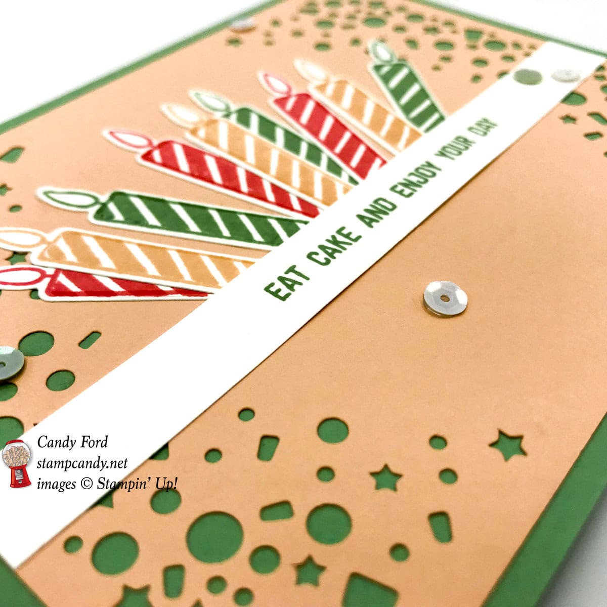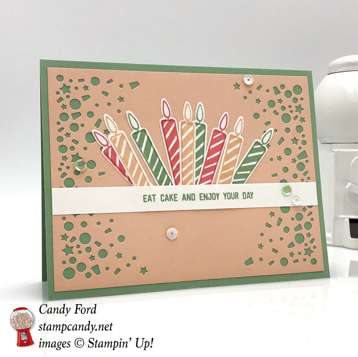 Today I’m sharing another card I made using the Blow Out the Candles stamp set. I also used the coordinating Candles & Confetti Framelits Dies on this one. (You can buy them bundled together to save 10%!) I didn’t really pay much attention to this set at first, but now that I’ve been playing with it, I realize how much fun it is. I mean, look at all those adorable birthday candles on this card. Cute!