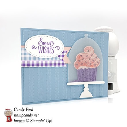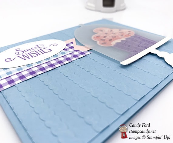 The Hello Cupcake stamp set is free with a $50 purchase through Sale-a-bration. On March 1, a coordinating set of dies, the Call Me Cupcake Framelits Dies, will be available to purchase. The dies make the stamp set so much more versatile! Check out the card I made for today in pastels hues, Balmy Blue, Highland Heather, Powder Pink, and Flirty Flamingo. Isn’t it just the sweetest?