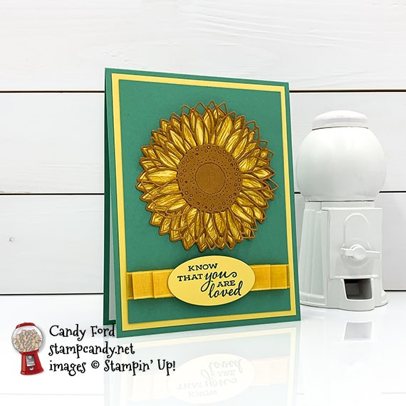 Today I’m sharing another card I made using the new Celebrate Sunflowers Bundle (Celebrate Sunflowers stamp set & Sunflowers Dies.) I colored some Whisper White ribbon with a Dark So Saffron Stampin’ Blends Marker. And I used Press & Seal plastic wrap to move lots of tiny die cut pieces from the die cutting machine to the card.