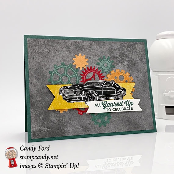 Today is my brother’s birthday. I won’t say how old he is, just that he’s much, much older than I am. 😀 But seriously, Happy Birthday, Bo! The new Classic Garage Suite in the 2019 Occasions Catalog is perfect for his birthday card. It has cars and motorcycles and gears and tools and – you get the idea – all things that he has always enjoyed tinkering with. For today’s card I used the Geared Up Garage stamp set, Garage Gears Thinlits dies, and Classic Garage Designer Series Paper (DSP.) I love that you can cut some of the images from the DSP using the dies! It’s how I cut the car and all the gears for today’s card.