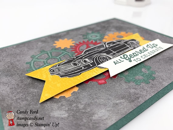 - DSP banner with car and sentiment adhered over the gears using Stampin’ Dimensionals