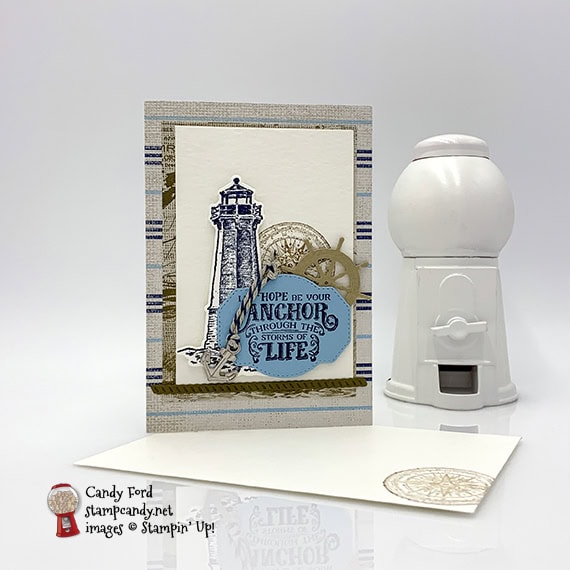 - sentiment, lighthouse, and helm glued together, then adhered onto the Watercolor Paper using Stampin’ Dimensionals