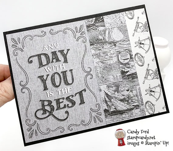 No, that isn’t a mistake. This is a card made with a card from the Come Sail Away Memories & More Card Pack. The M&M card packs make it super quick and easy to make a card – just adhere it onto the front of a card base and you’re done! This card also has a couple pieces of Come Sail Away Designer Series Paper.