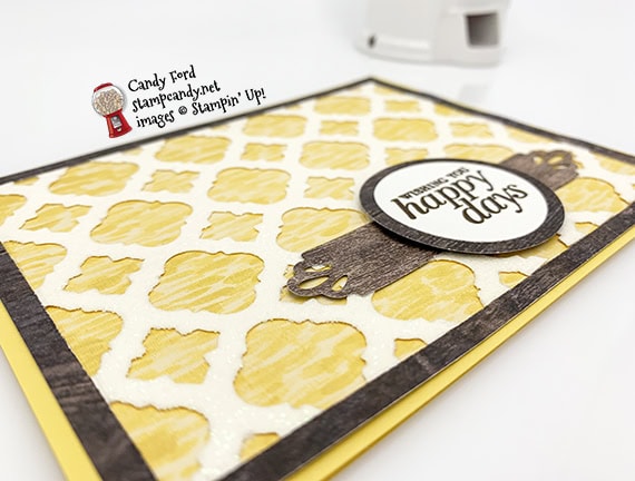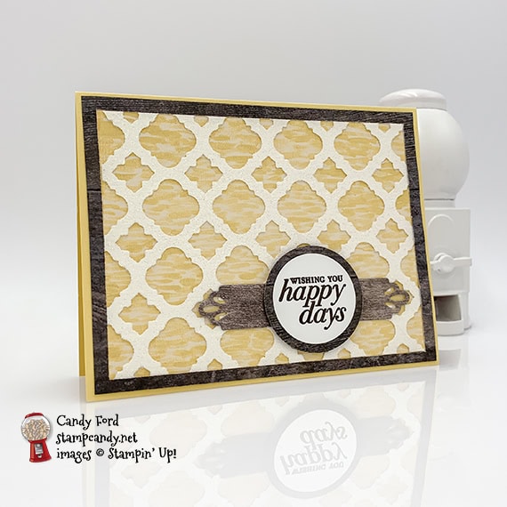 Recently I used the Florentine Filigree Thinlits Die to create a template for applying Shimmery White Embossing Paste to the front of a card. Afterward, I realized the template was covered in the paste, and of course I had to save it for another project. For today’s card, I glued the shimmery die cut template over Garden Impressions Designer Series Paper, and added accents of Wood Textures Designer Series Paper.