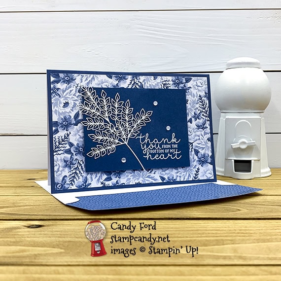 For today’s thank you card, I used the Bloom & Grow stamp set with the Flowers for Every Season Memories & More Cards & Envelopes, Flowers for Every Season Memories & More Card Pack, Forever Gold Laser-Cut Specialty Paper, and Frosted & Clear Epoxy Droplets. You know how I love monochromatic cards, and today’s is a real beauty in Misty Moonlight with Whisper White. I like all the 2020-2022 In Colors, but this dusty blue is quickly becoming my favorite.