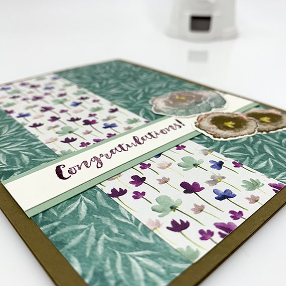 Today’s card is made with the Frosted Floral Suite, which is really versatile. Here I’ve made a congratulations card, but there are three very different sentiments in the stamp set. And the paper has a 13 different Stampin’ Up! colors, so you can make a plethora of different projects. I used the First Frost stamp set, Frosted Bouquet Framelits Dies, and Frosted Floral Designer Series Paper for this card.