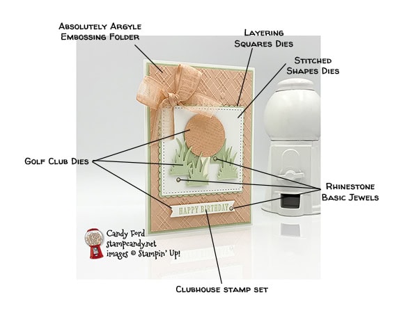 Today’s card is made with the Country Club Suite, but using colors that might not immediately come to mind when you think of this set. While golf is usually considered a masculine sport, there are girly girl golfers, too. I used Petal Pink and Soft Sea Foam with a bit of clear Wink of Stella to froufrou it up a bit.