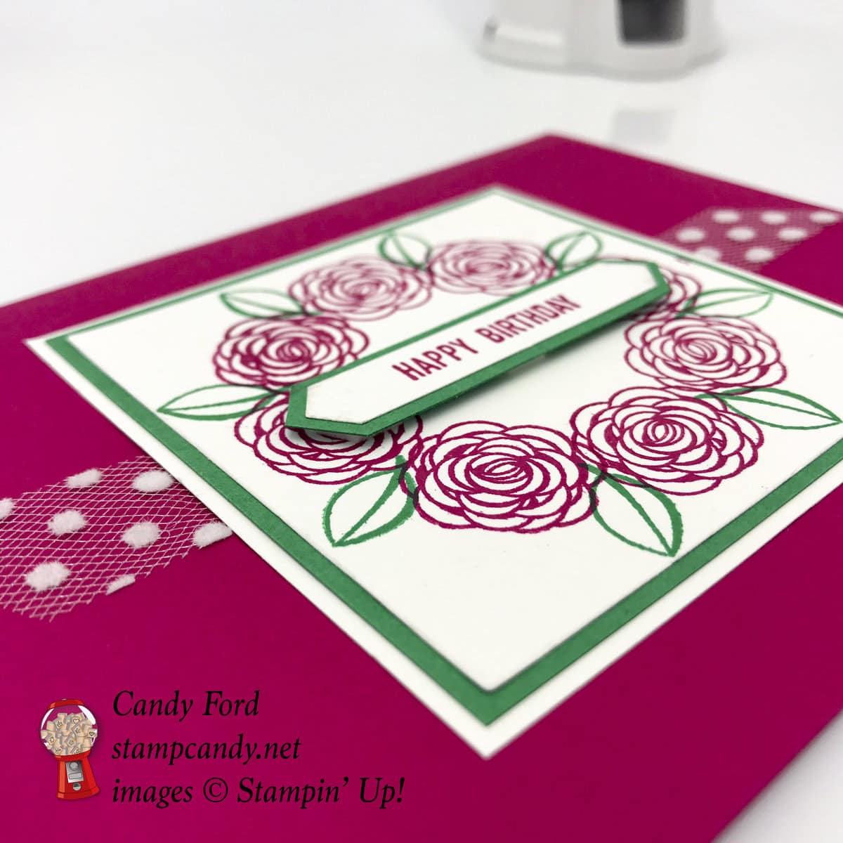 Today I’m sharing one of the examples I made for the day I spent with the Stamp or Dye group. You can see my post about our gathering here. I used the Happy Birthday Gorgeous stamp set for the flowers & leaves of the wreath, and the Itty Bitty Greetings stamp set for the sentiment, which I cut using the Classic Label Punch.