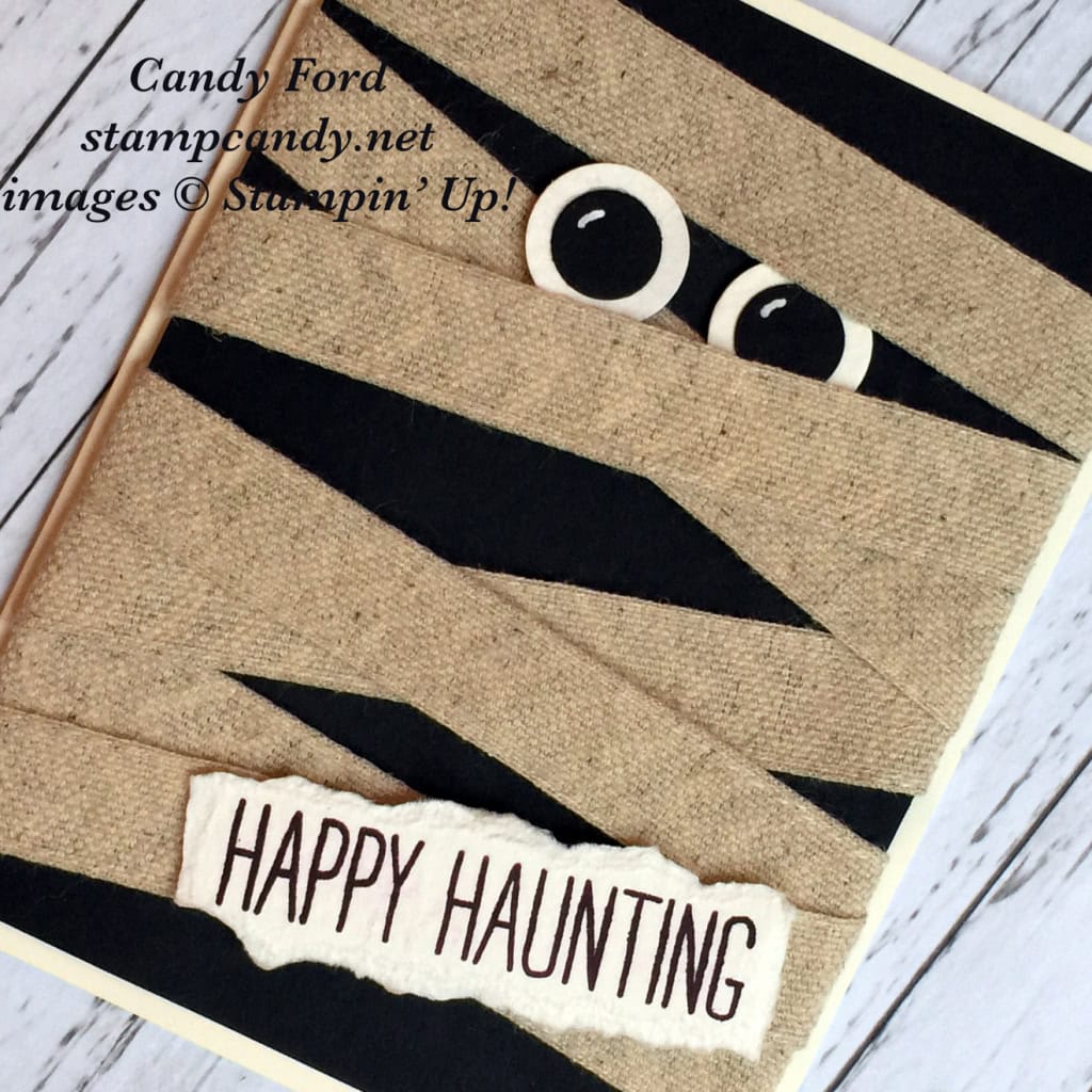 This cute little mummy looks more frightened than frightening, but he’s here to wish you a Happy Halloween! I wish I could take credit for this design, but my friend and fellow Stampin’ Up! Demo Jackie Bak saw the sketch and said a mummy was the first thing that came to her mind. So I said, “let’s go with that!”