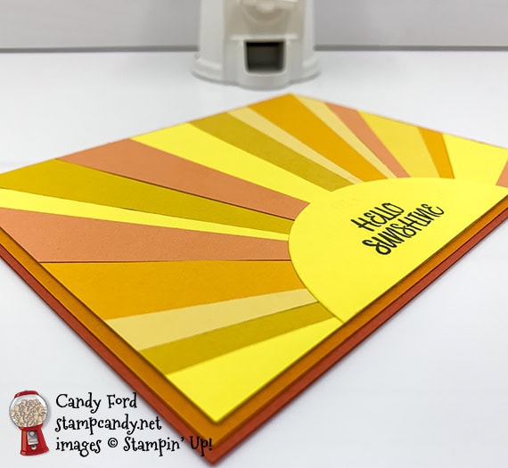 - a strip of each color CS (Mango Melody, Grapefruit Grove, Crushed Curry, Daffodil Delight, So Saffron, Pineapple Punch, and Bumble Bee) cut to 1″ x 5″, then cut diagonally from corner to corner to create “rays”