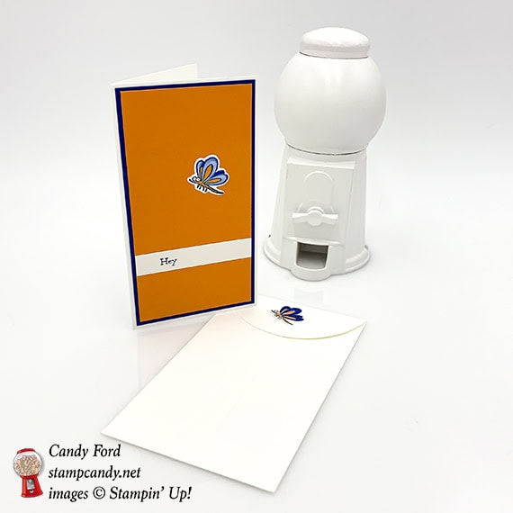 I colored two dragonflies in Blueberry Bushel and Pumpkin Pie: one of then directly with the markers, and the other one with a Blender Pen. I like the way both of them came out, but not necessarily side by side. So I opted to put one on the card and one on the envelope.