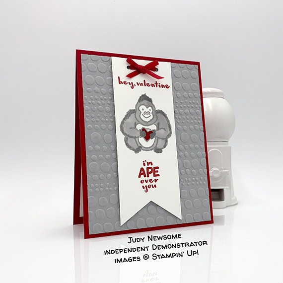 This is the third day I’ve shared a card made by one of my Candy Hearts team members for our January team meeting swap. Judy Newsome of Lafayette, GA, used the Hey Love stamp set with the Dot to Dot embossing folder and a couple of punches to create this fun Valentine. And it has a pun! And you know how I love puns! Look at the cute little gorilla and the sentiment “I’m ape over you.” And the embossed dots in the background add even more whimsy. This card would be perfect for a child, but could also be given to any fun loving adult.