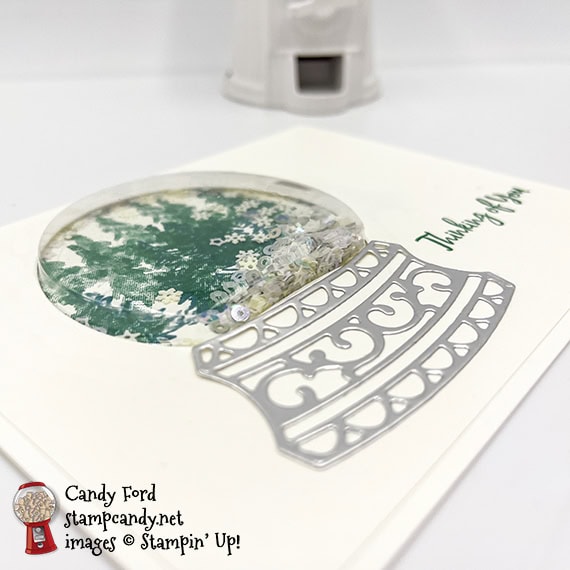 Today I’m sharing another card we made at my Stamp Club’s December virtual gathering. It could be a Christmas holiday card, or just a wintery thinking of you card. We used the In the Pines stamp set, Snow Globe Scenes Dies, Snow Globe Shaker Domes, and Snowflake Sequins to make this lovely shaker dome card.