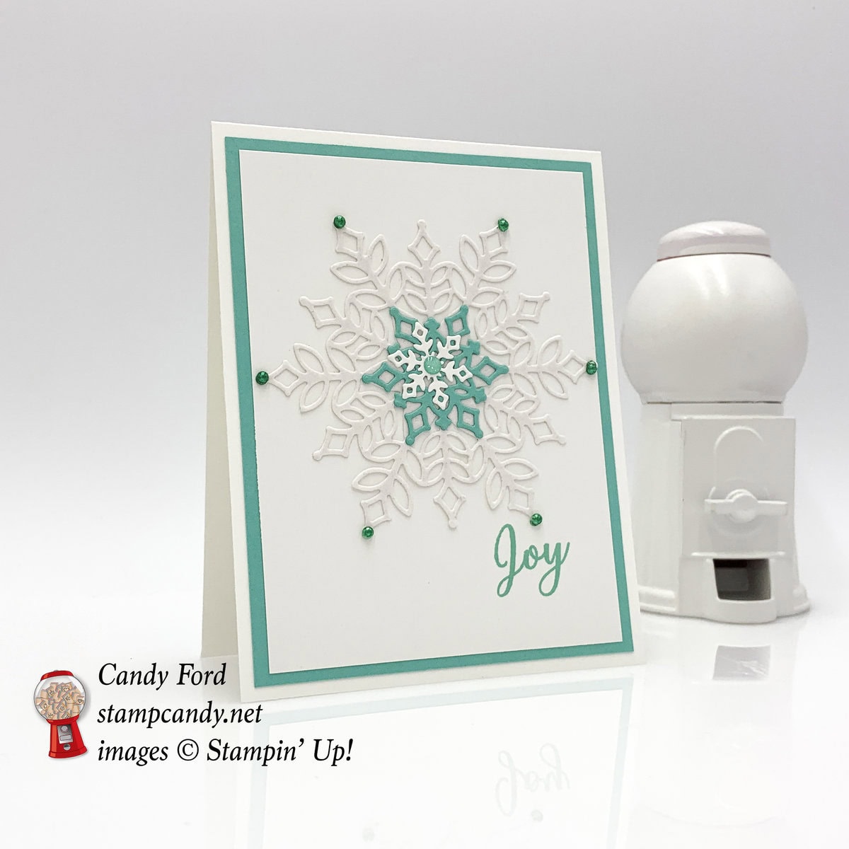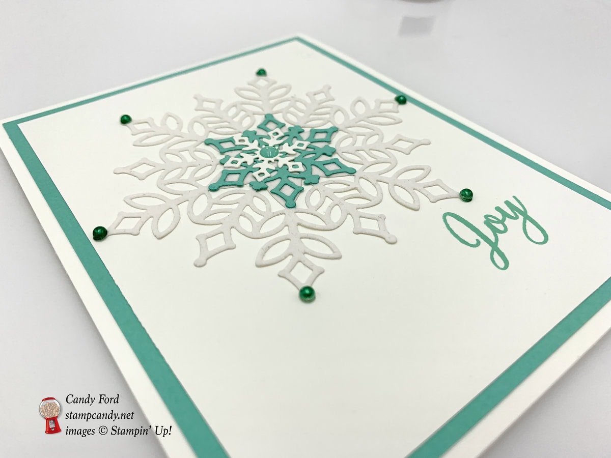 Today I’m sharing one more card I made using the Snowflake Showcase products. I hope you were able to buy yours while they were available in November. I used the Snow is Glistening stamp set and the Snowfall Thinlits Dies. And I colored some pearls with a Blends Marker as the little tips of the snowflake.