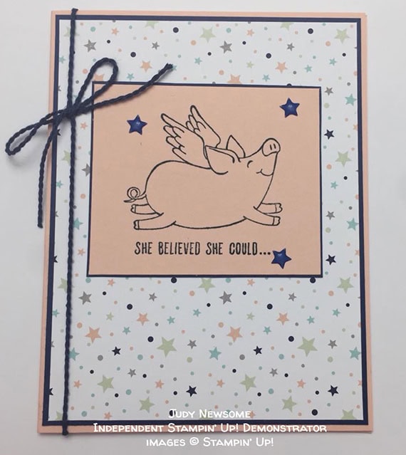Judy Newsome made all the cards in today’s post. She’s a member of my Candy Hearts team of Demonstrators, and she lives in LaFayette, Georgia. By the way, in Walker County, GA, it’s pronounced la-FAY-it instead of LAH-fay-YET. You may notice that most of Judy’s cards (12 of the 16) have ribbon or twine. She’s an amazing seamstress and her love of fabric and trims spills over into her amazing card making.