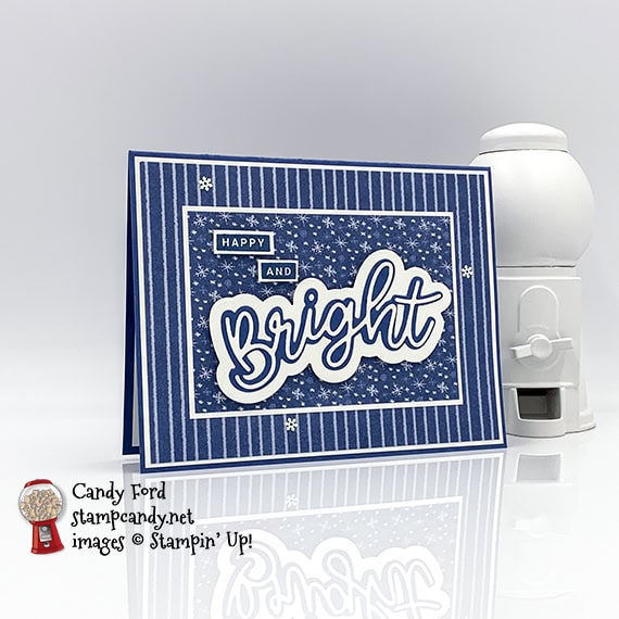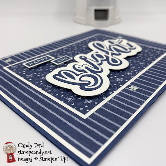 - BRIGHT die cut stack, HAPPY, and AND adhered onto the smaller DSP layer using Stampin’ Dimensionals