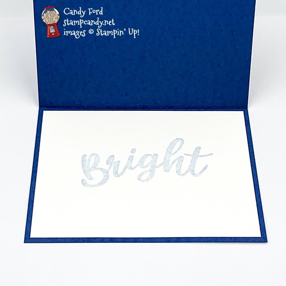- BRIGHT in Misty Moonlight ink, stamped off three times, onto the 5-1/4″ x 4″ Whisper White CS (I wanted it to be very light, like a watermark, so I could write over it.)