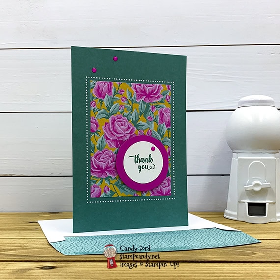 I made today’s thank you card in 2020-2022 In Colors, featuring Just Jade, using the Flowering Blooms stamp set, Layering Circles Dies, Flowers for Every Season Memories & More Cards & Envelopes. Flowers for Every Season Memories & More Card Pack, and 2020-2022 In Color Enamel Dots.